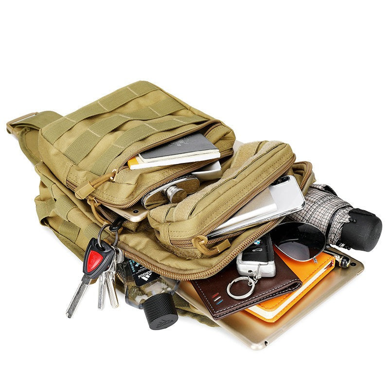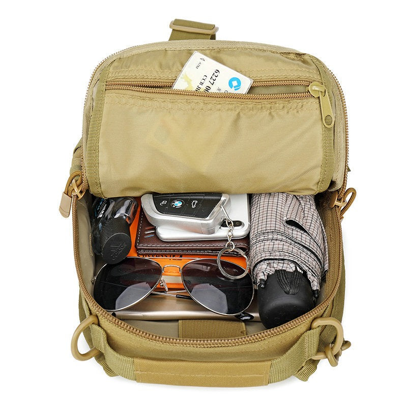 - Three front mounted zippered compartments for organizing your gear. Multiple pockets and elastic bands to keep your stuff organized.